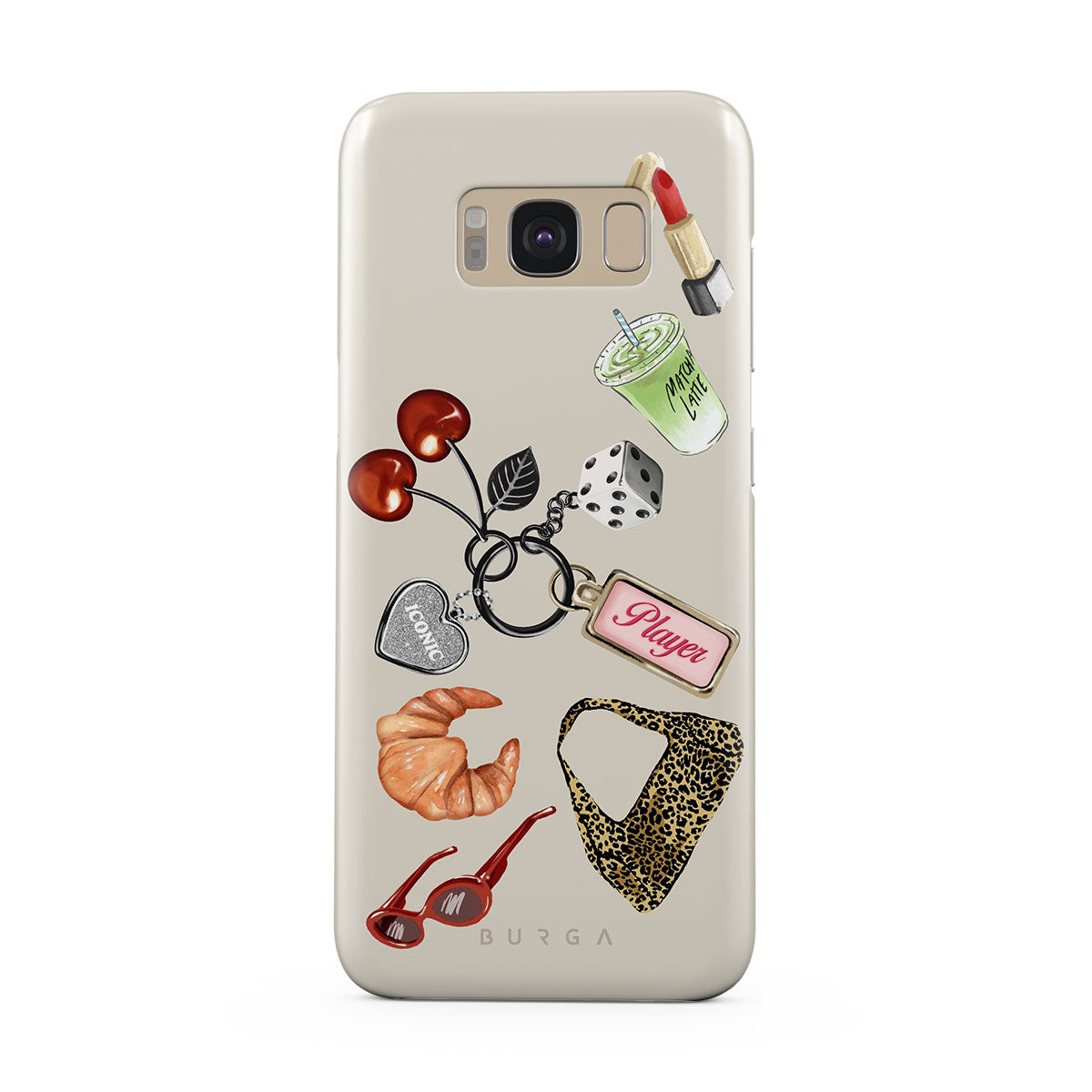 Este design contém: óculos de sol vermelhos, batom vermelho, bebida de matcha verde, croissant, dados pretos, mala com padrão leopardo, porta-chaves com coração prateado, cerejas, dados e etiqueta "Jogadora".