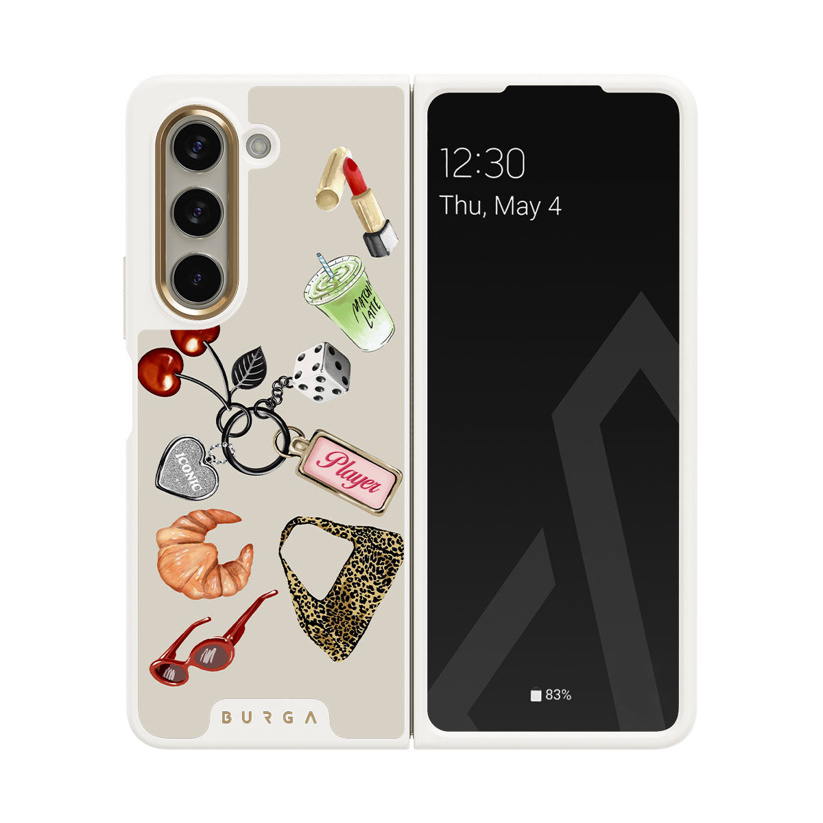 Este design contém: óculos de sol vermelhos, batom vermelho, bebida de matcha verde, croissant, dados pretos, mala com padrão leopardo, porta-chaves com coração prateado, cerejas, dados e etiqueta "Jogadora".