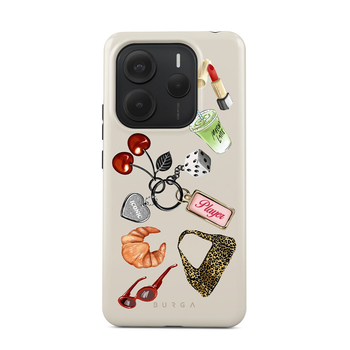 Este design contém: óculos de sol vermelhos, batom vermelho, bebida de matcha verde, croissant, dados pretos, mala com padrão leopardo, porta-chaves com coração prateado, cerejas, dados e etiqueta "Jogadora".