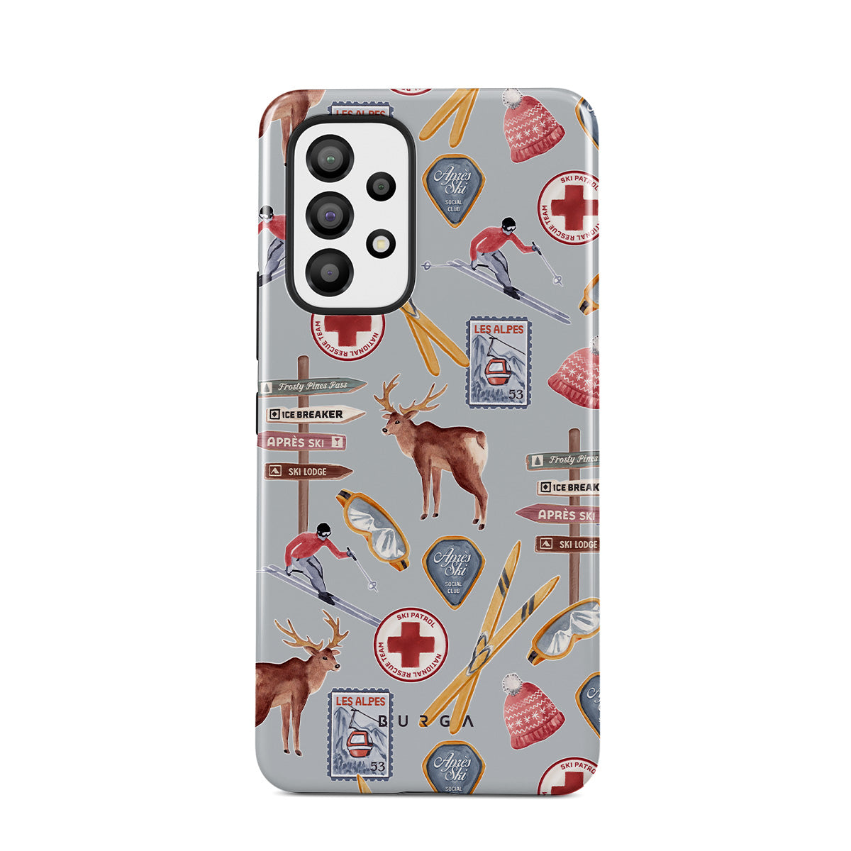 Este design contém: pôster de esqui vintage, estação de esqui retro, ilustração de rena, design de teleférico, padrão alpino, esportes de inverno, estilo clássico de chalé de esqui, gráficos de resort de montanha