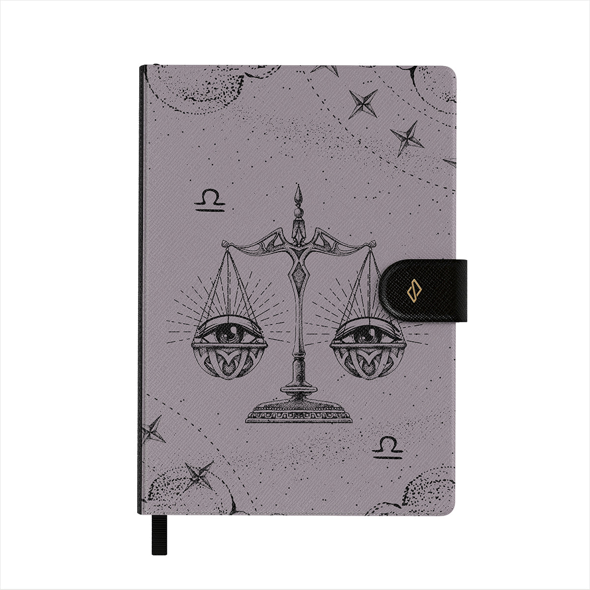 Apresenta padrões BURGA bem detalhados numa capa em pele sintética vegana, com um elegante marcador de páginas em fita preta.