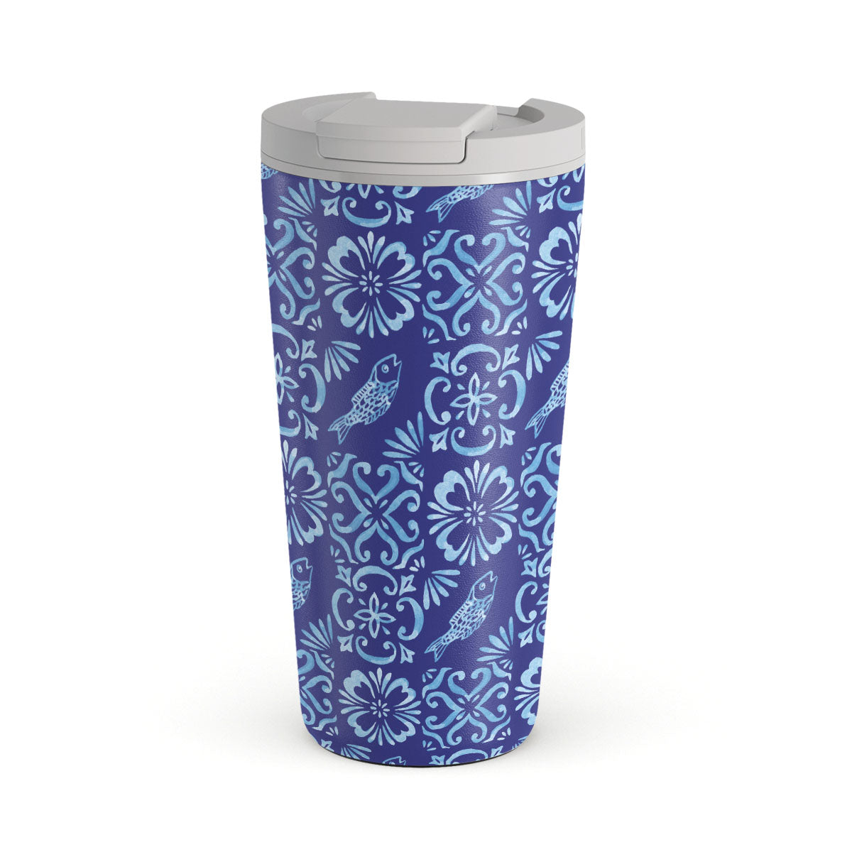 Este design contém: padrões de azulejos portugueses, azuis profundos, padrões florais, flores, peixes