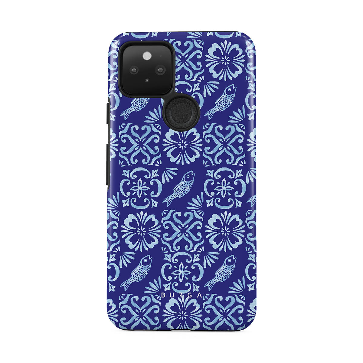 Este design contém: padrões de azulejos portugueses, azuis profundos, padrões florais, flores, peixes