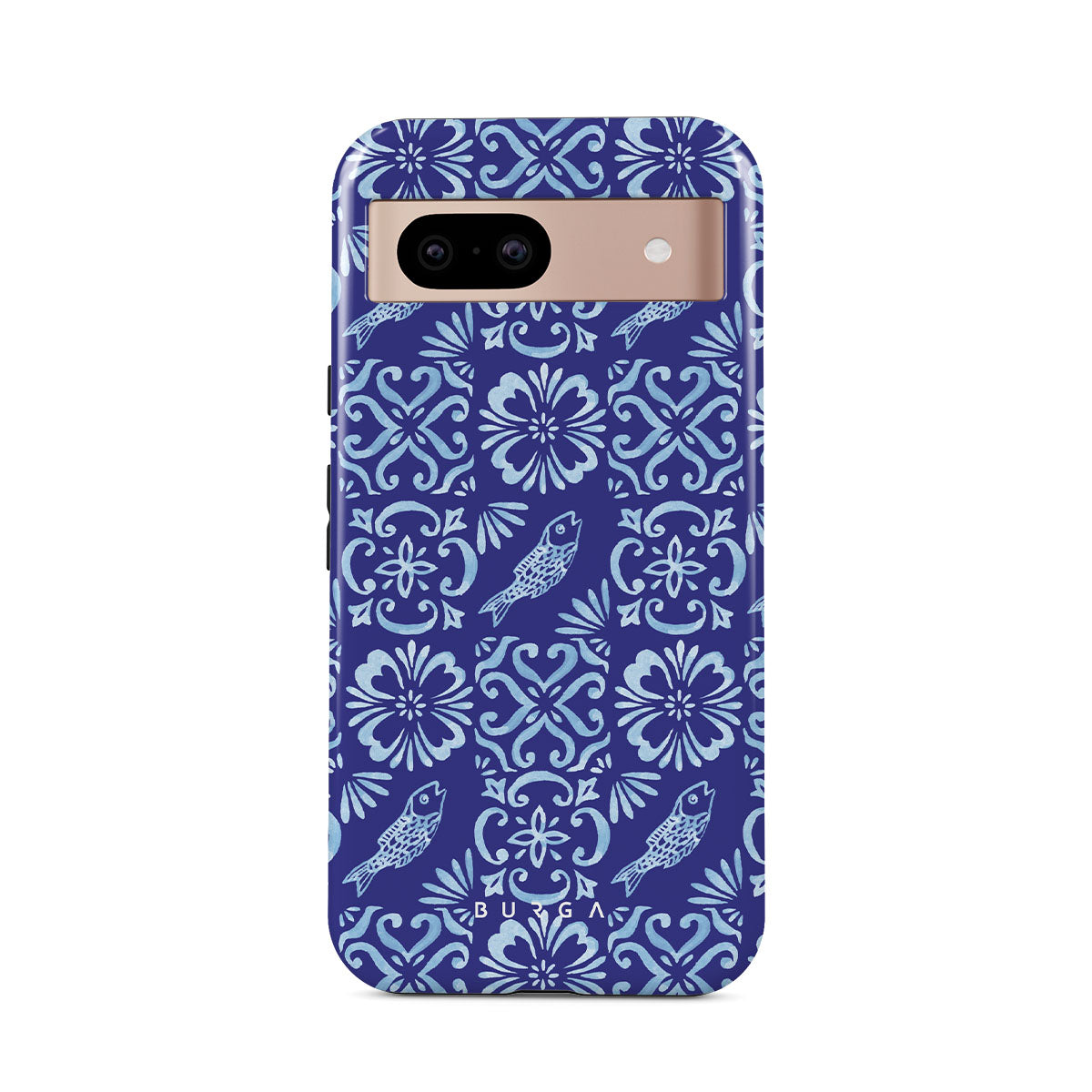 Este design contém: padrões de azulejos portugueses, azuis profundos, padrões florais, flores, peixes
