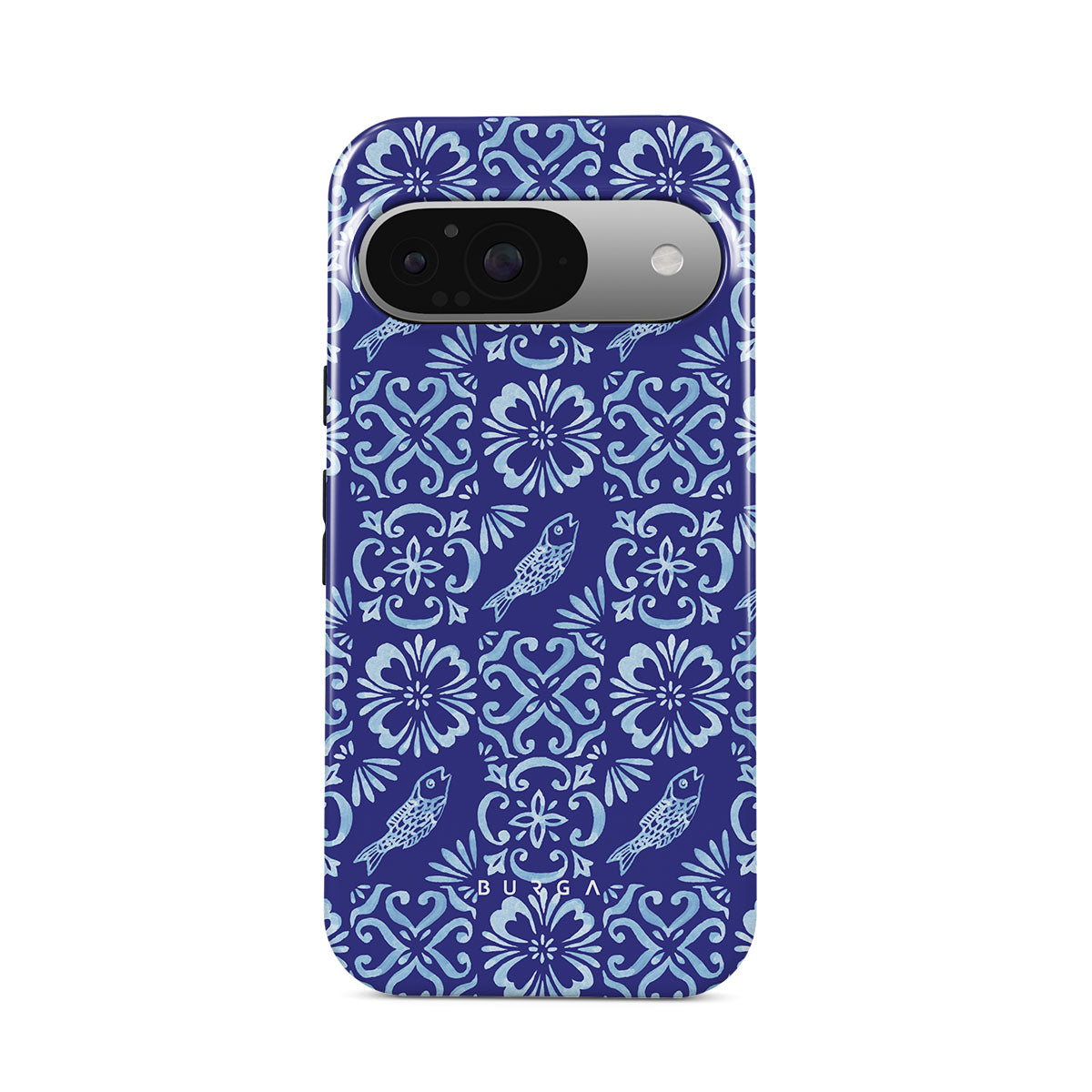 Este design contém: padrões de azulejos portugueses, azuis profundos, padrões florais, flores, peixes