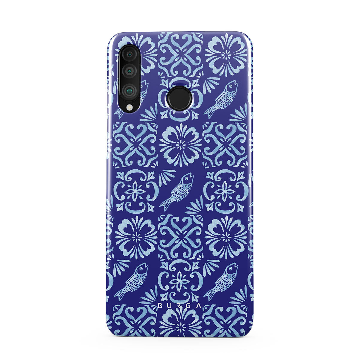 Este design contém: padrões de azulejos portugueses, azuis profundos, padrões florais, flores, peixes