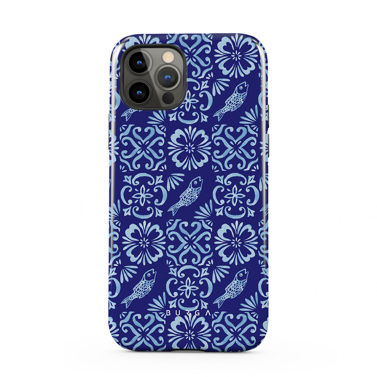 Este design contém: padrões de azulejos portugueses, azuis profundos, padrões florais, flores, peixes