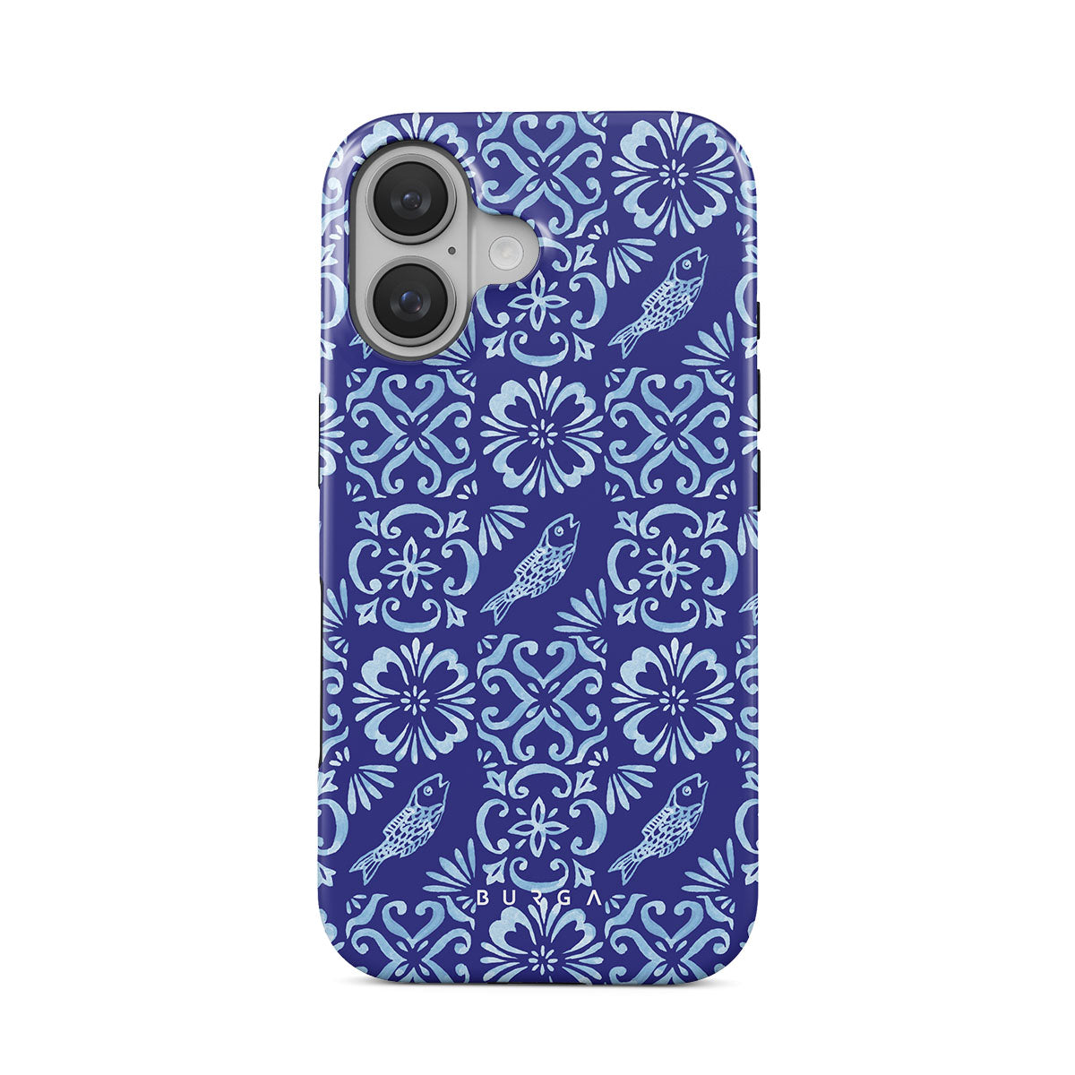 Este design contém: padrões de azulejos portugueses, azuis profundos, padrões florais, flores, peixes