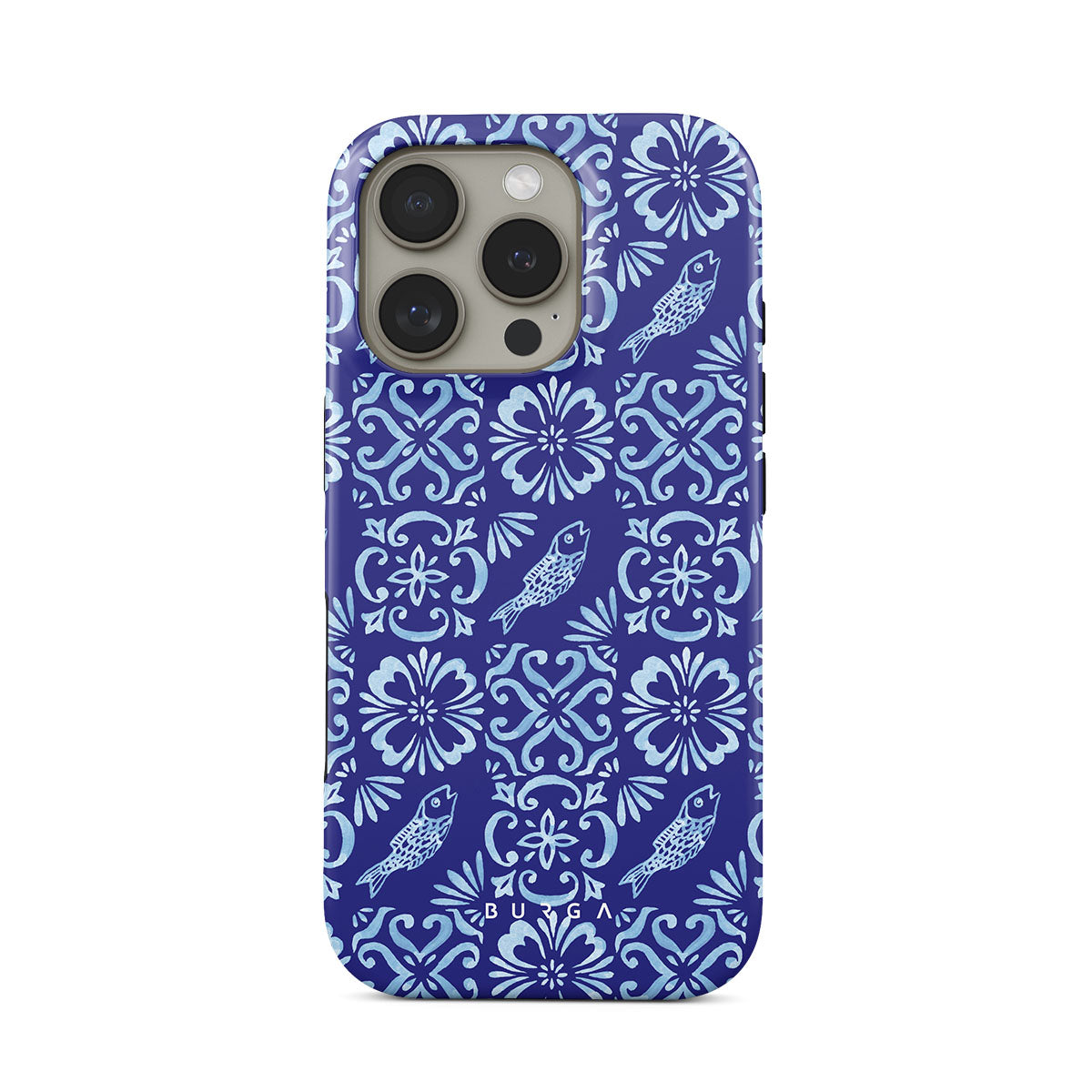 Este design contém: padrões de azulejos portugueses, azuis profundos, padrões florais, flores, peixes