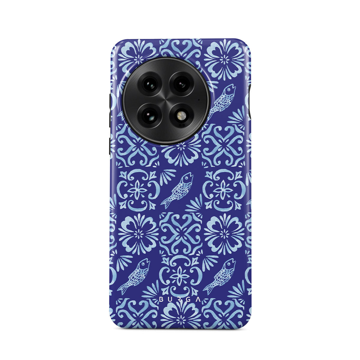 Este design contém: padrões de azulejos portugueses, azuis profundos, padrões florais, flores, peixes