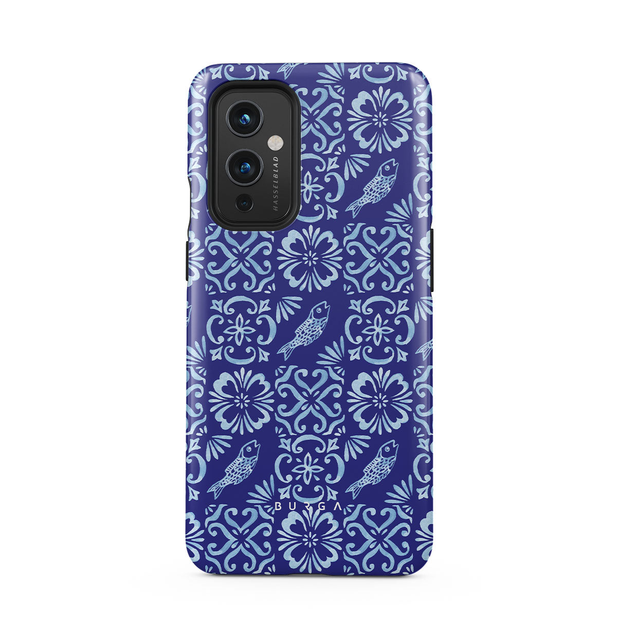 Este design contém: padrões de azulejos portugueses, azuis profundos, padrões florais, flores, peixes
