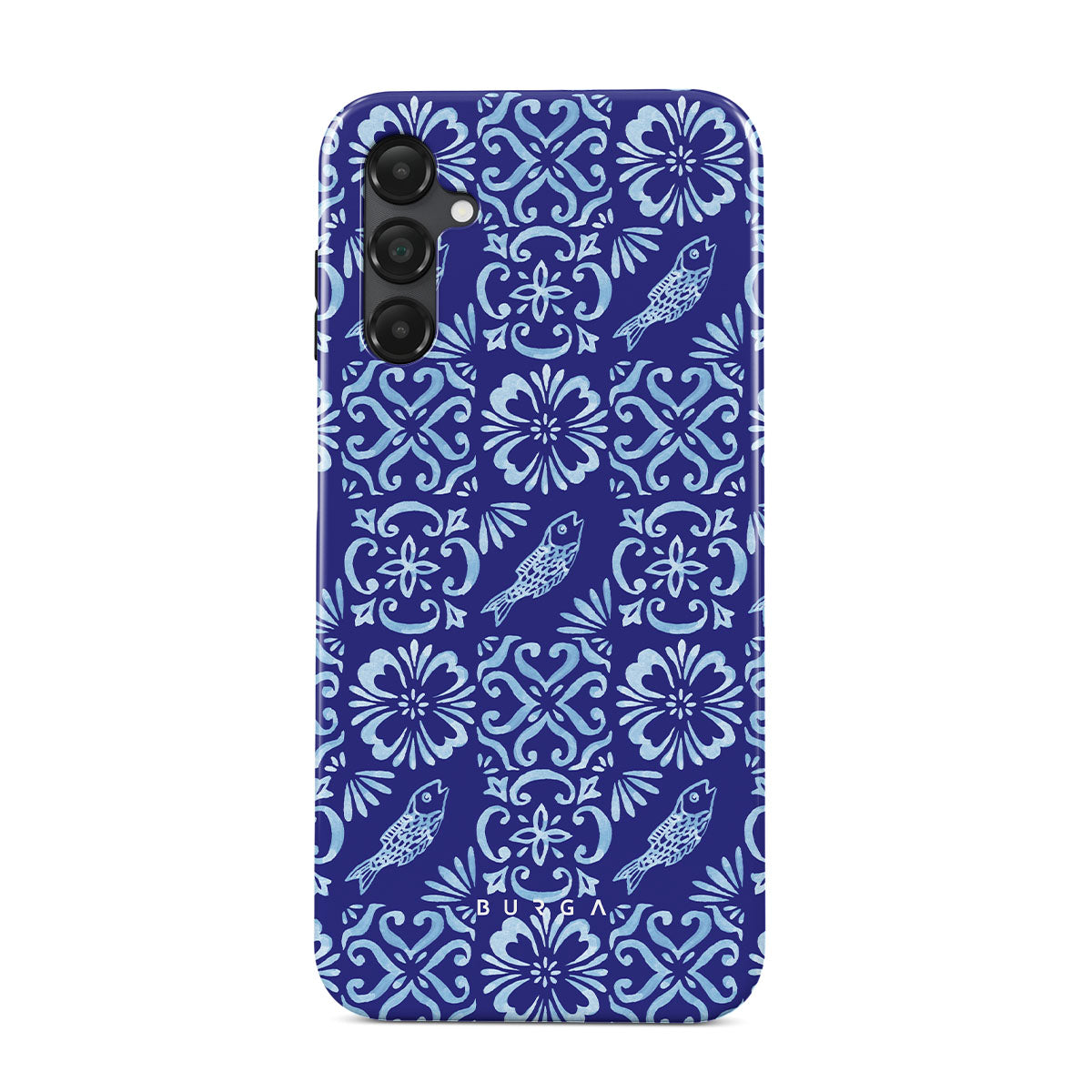Este design contém: padrões de azulejos portugueses, azuis profundos, padrões florais, flores, peixes