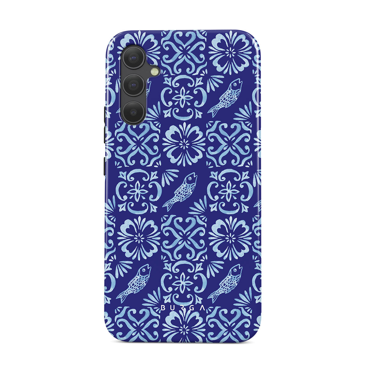 Este design contém: padrões de azulejos portugueses, azuis profundos, padrões florais, flores, peixes