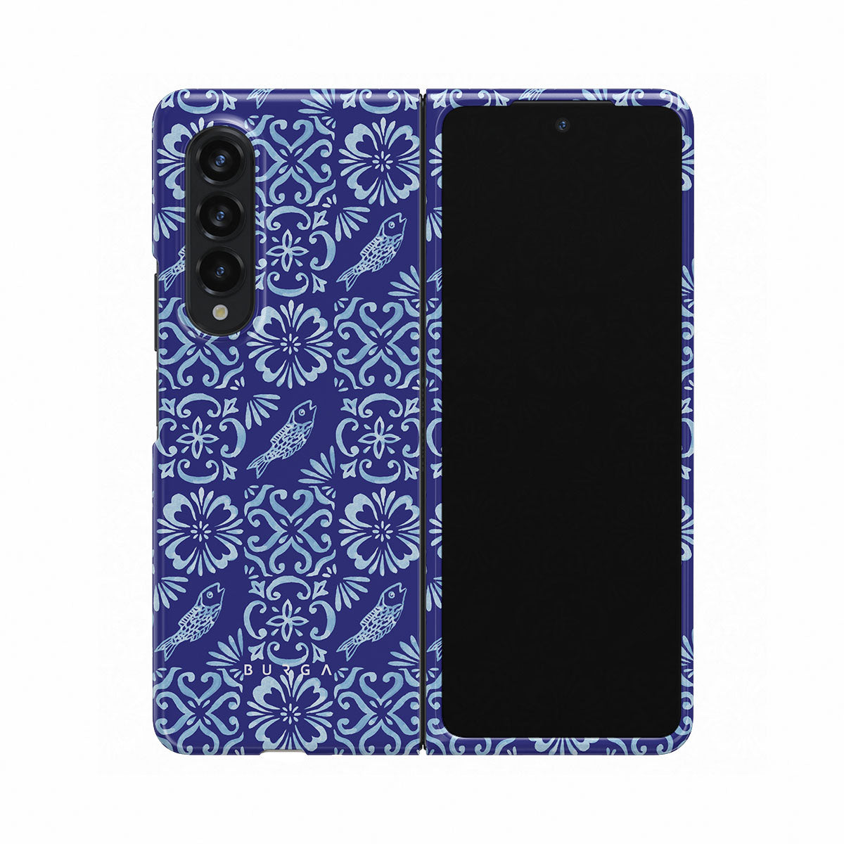Este design contém: padrões de azulejos portugueses, azuis profundos, padrões florais, flores, peixes