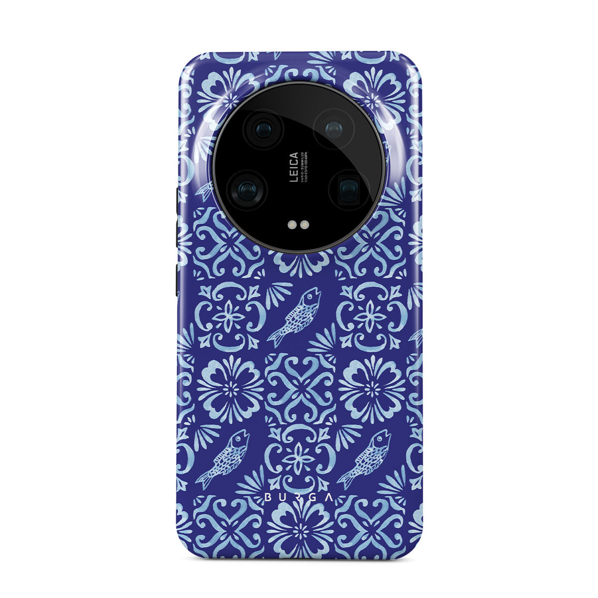 Este design contém: padrões de azulejos portugueses, azuis profundos, padrões florais, flores, peixes