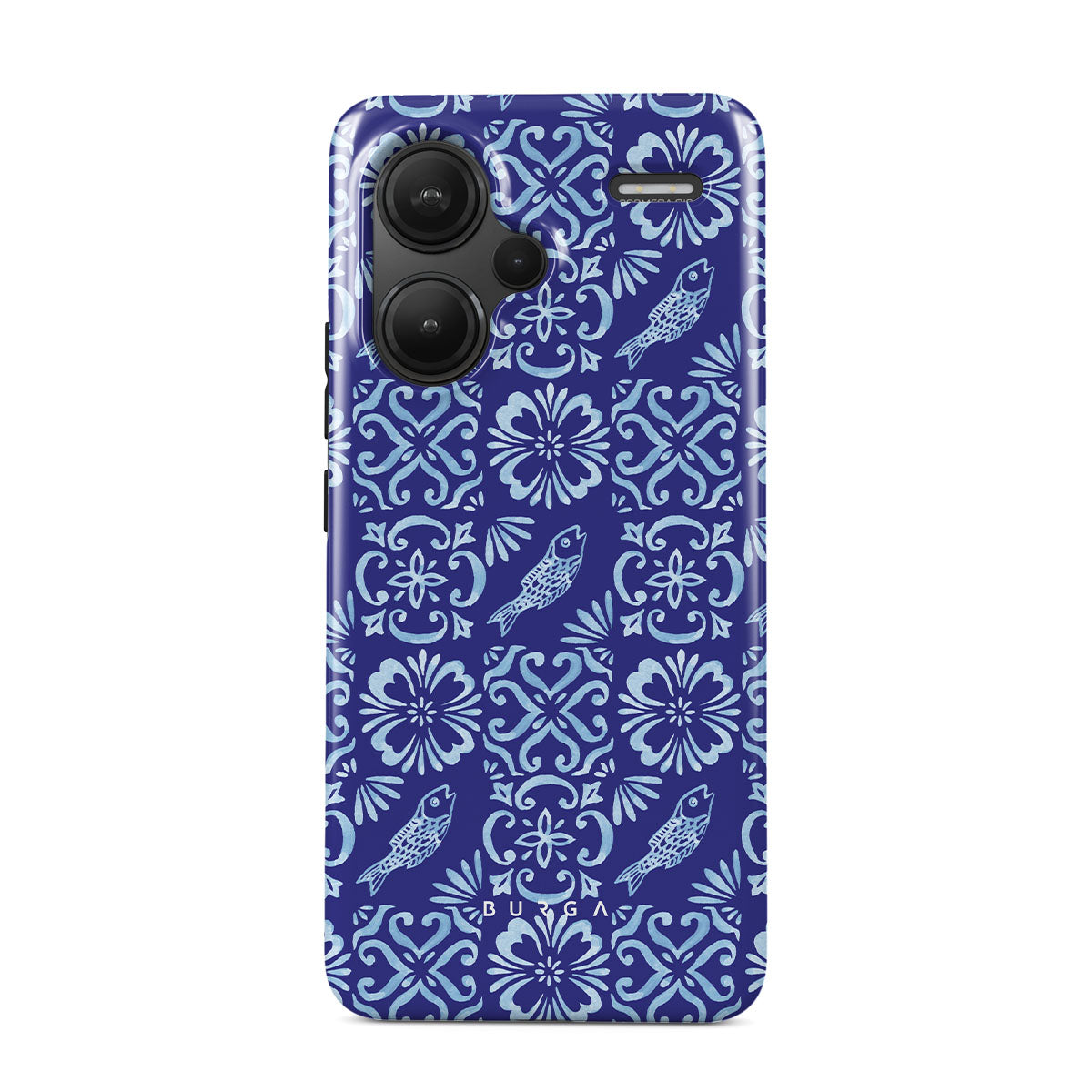 Este design contém: padrões de azulejos portugueses, azuis profundos, padrões florais, flores, peixes