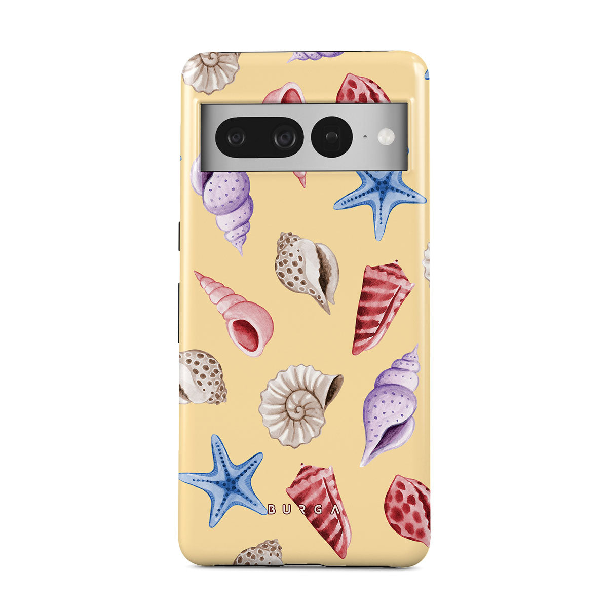 Este design contém: conchas, estrelas do mar, fundo amarelo pastel, tema oceânico.