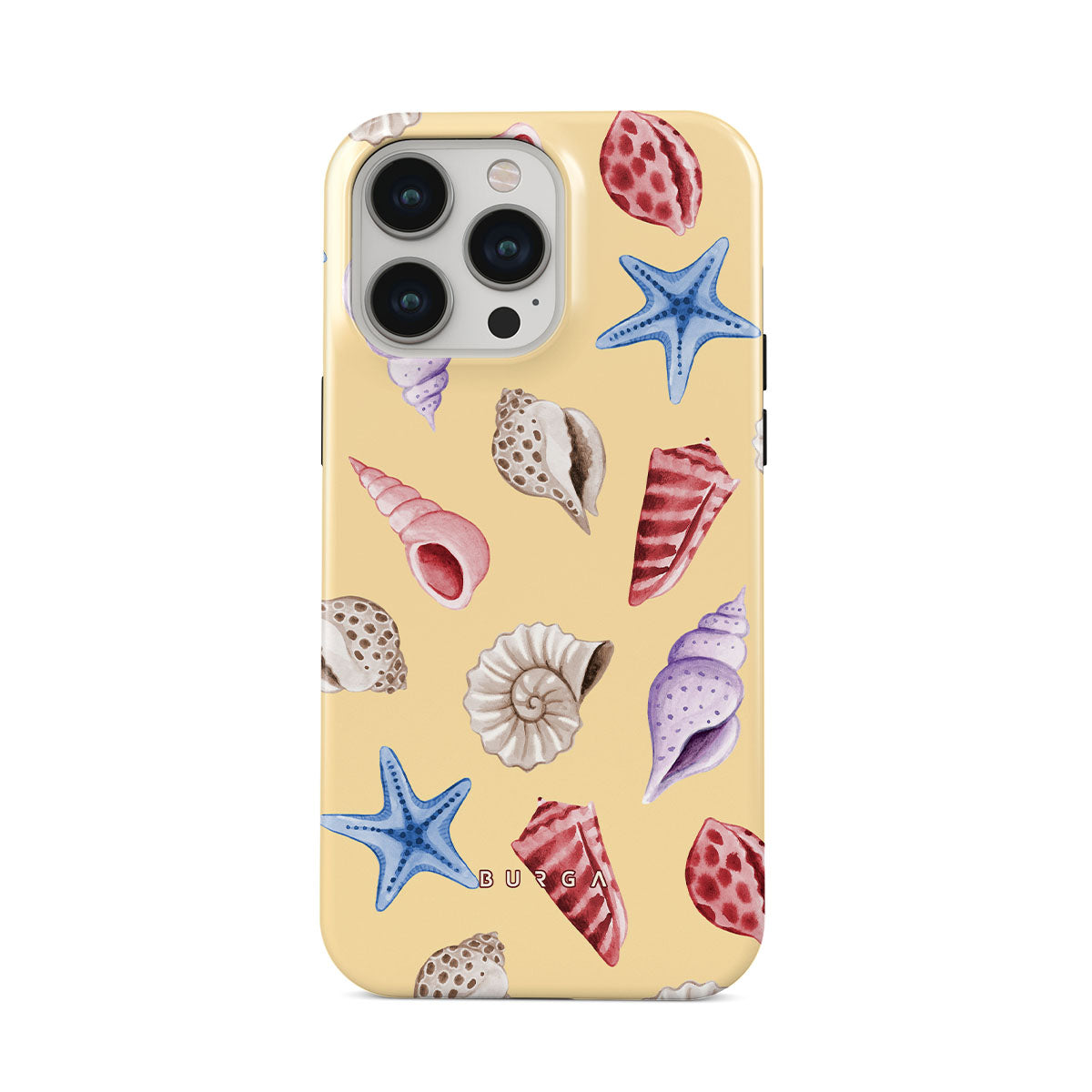 Este design contém: conchas, estrelas do mar, fundo amarelo pastel, tema oceânico.