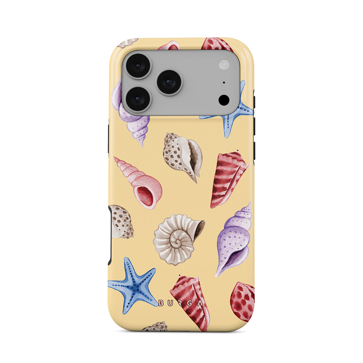 Este design contém: conchas, estrelas do mar, fundo amarelo pastel, tema oceânico.