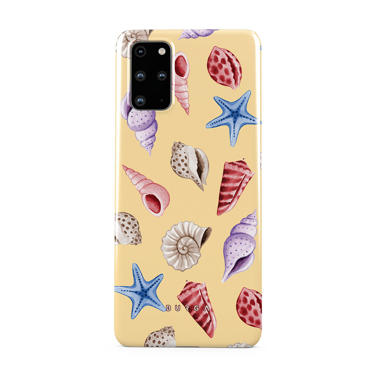 Este design contém: conchas, estrelas do mar, fundo amarelo pastel, tema oceânico.