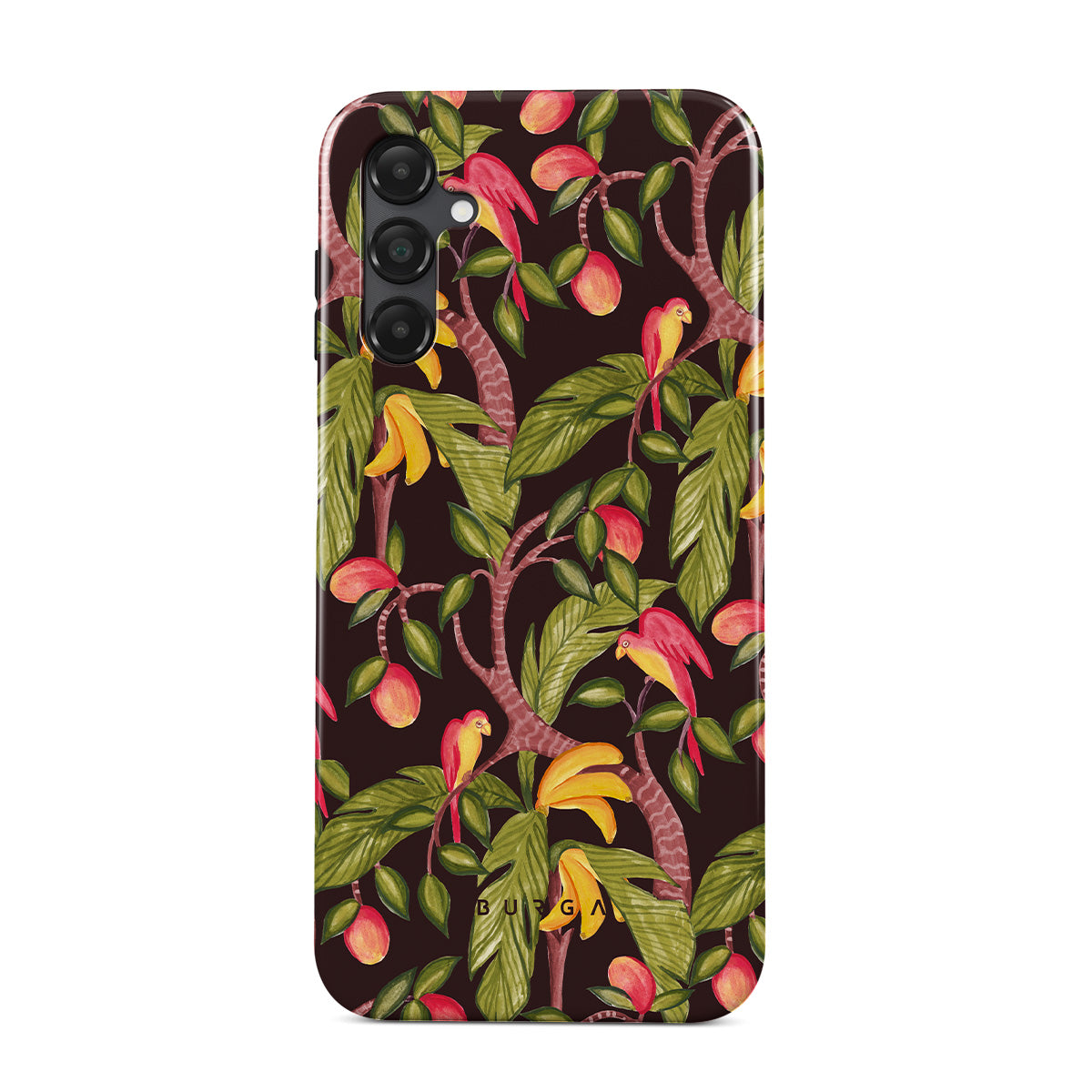 Este design contém: mangas, folhas verde escuras, padrão inspirado na selva
