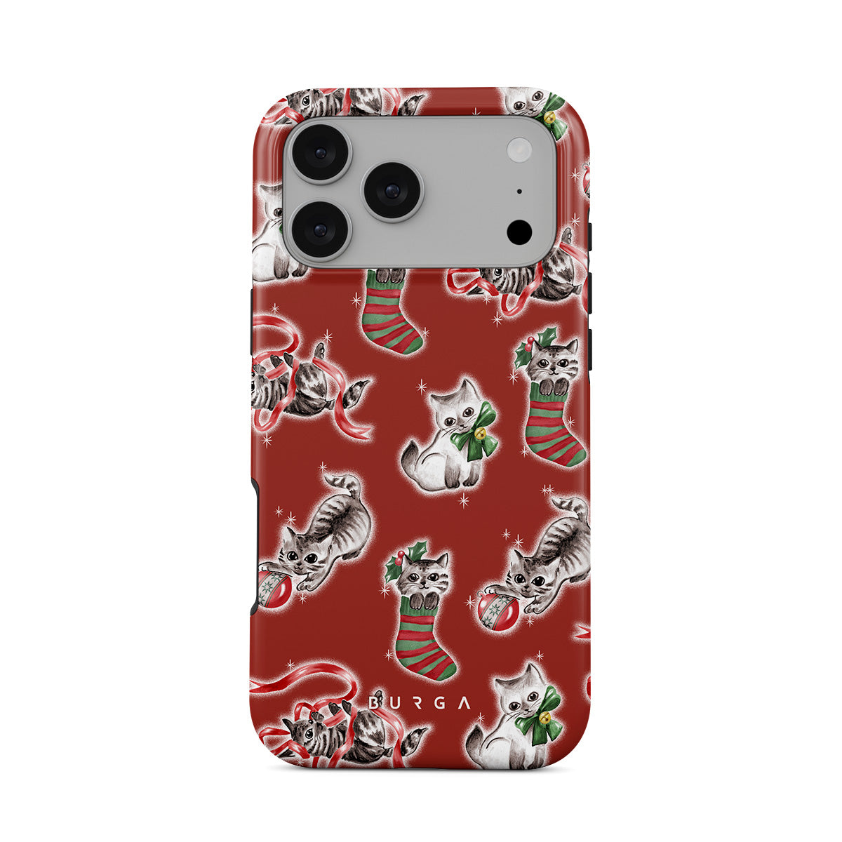 Este design contém: gatos, meias de Natal, gatinhos, padrão vermelho e verde, gatos brincalhões, decorações de Natal