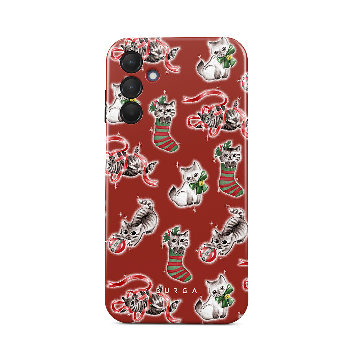 Este design contém: gatos, meias de Natal, gatinhos, padrão vermelho e verde, gatos brincalhões, decorações de Natal