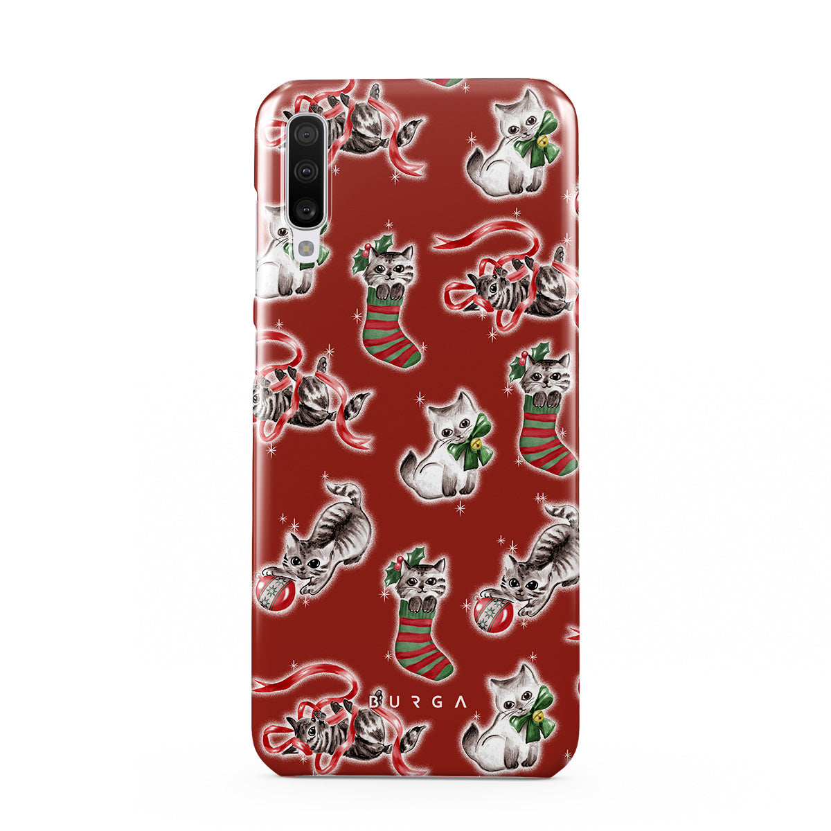 Este design contém: gatos, meias de Natal, gatinhos, padrão vermelho e verde, gatos brincalhões, decorações de Natal