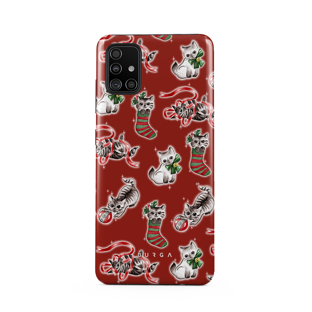 Este design contém: gatos, meias de Natal, gatinhos, padrão vermelho e verde, gatos brincalhões, decorações de Natal