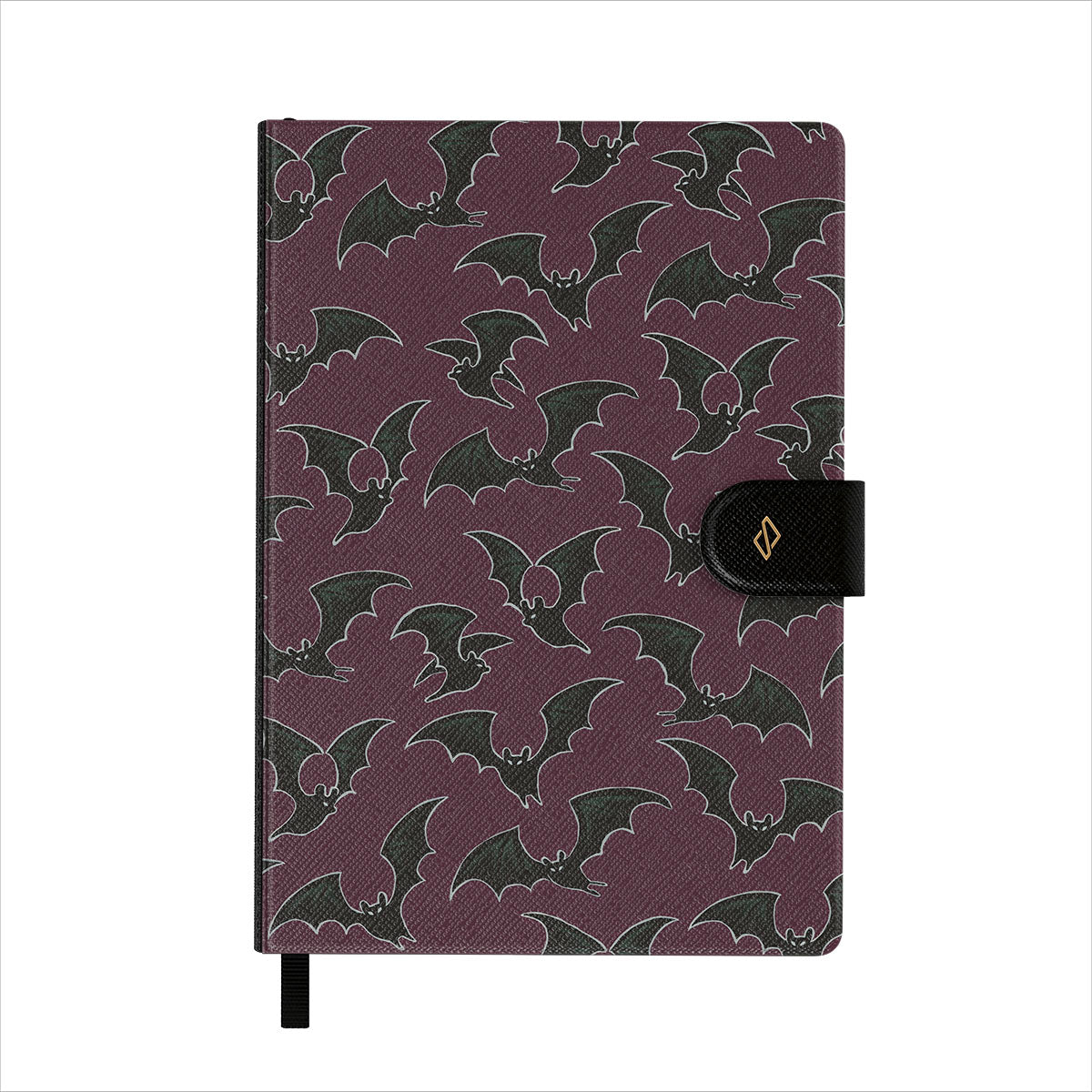 Apresenta padrões BURGA bem detalhados numa capa em pele sintética vegana, com um elegante marcador de páginas em fita preta.