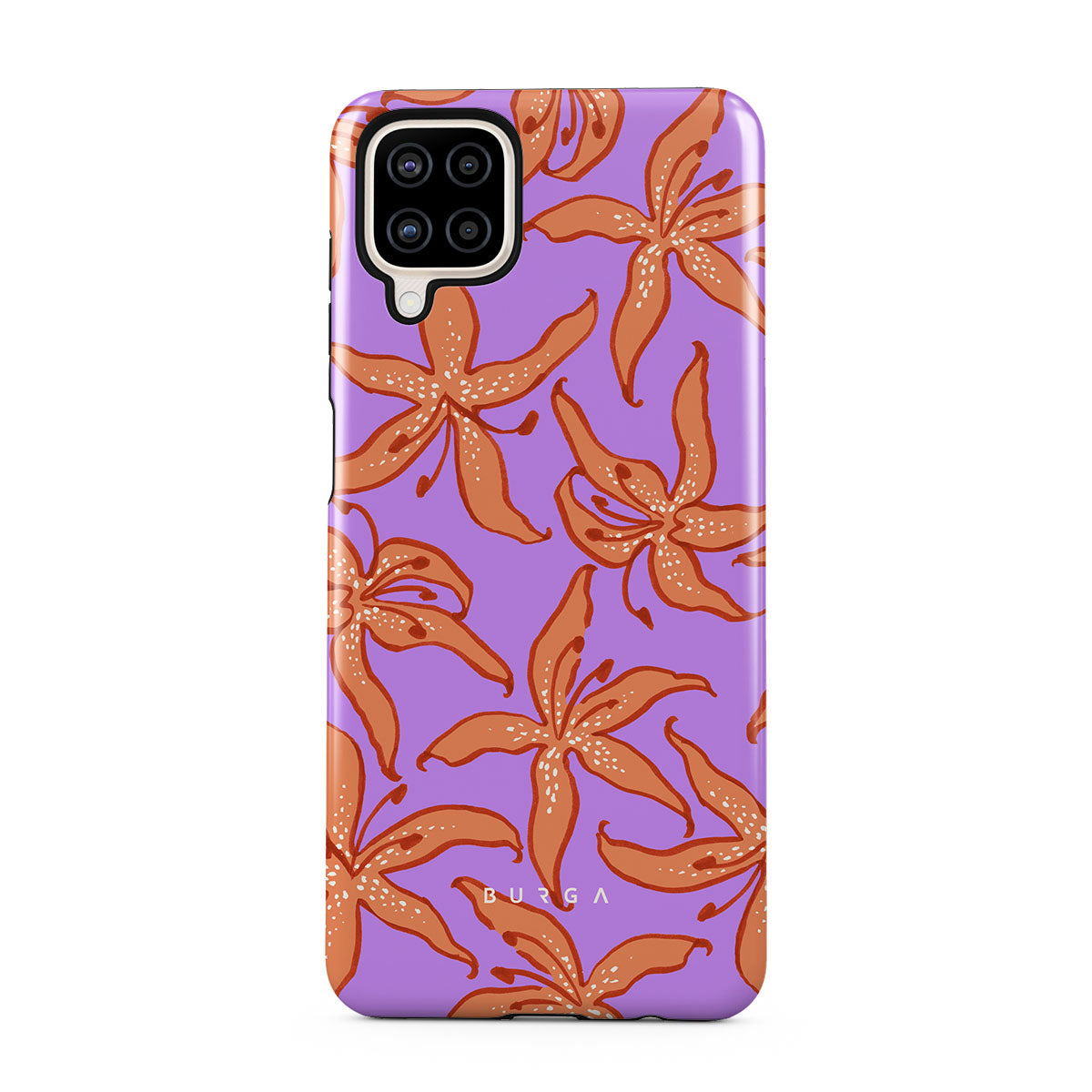 Este design contém: lírios laranja, fundo roxo.