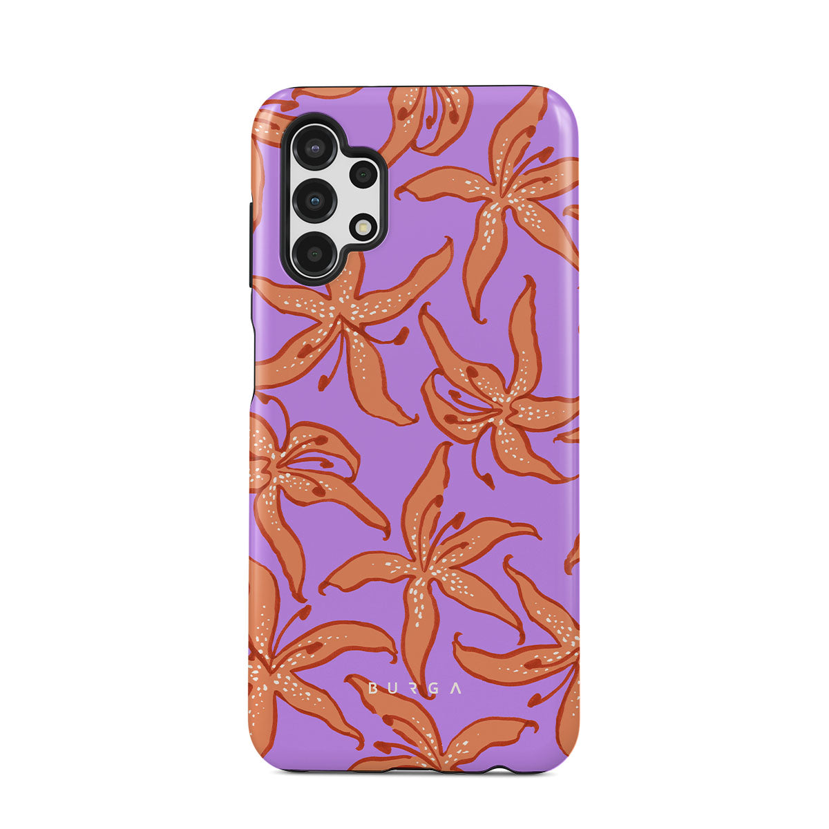 Este design contém: lírios laranja, fundo roxo.