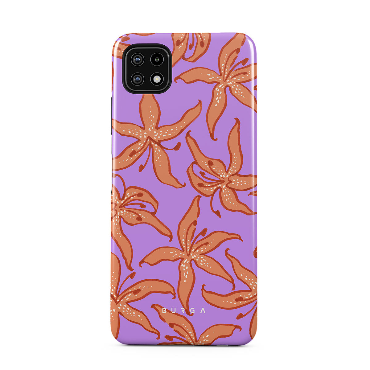 Este design contém: lírios laranja, fundo roxo.