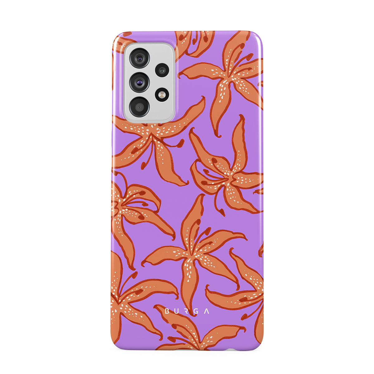 Este design contém: lírios laranja, fundo roxo.