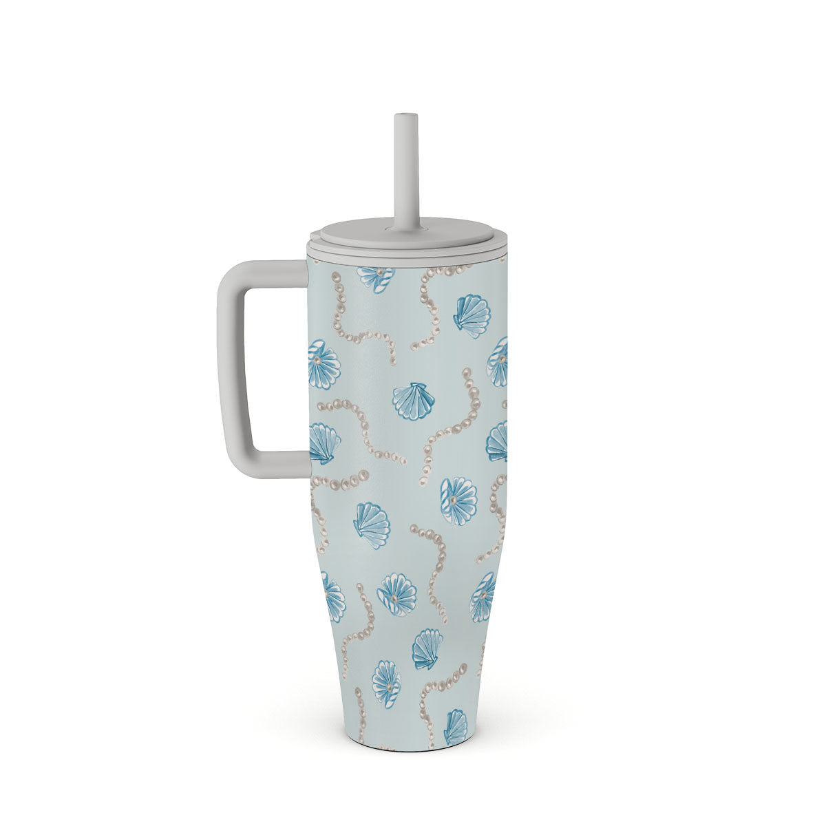 Este design contém: pérolas, conchas, fundo azul claro, elementos marinhos.