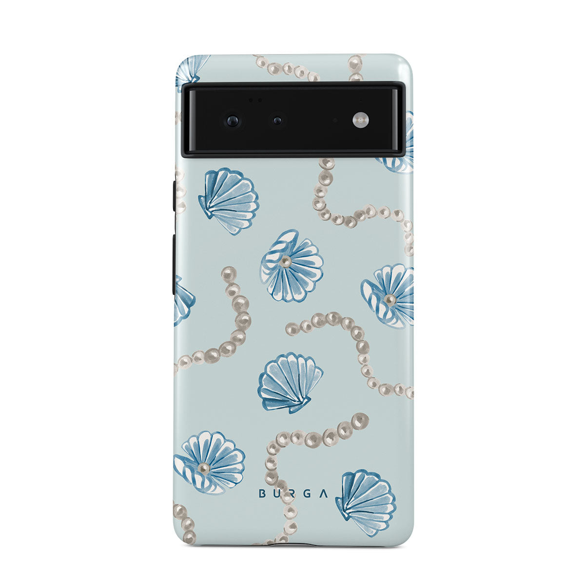 Este design contém: pérolas, conchas, fundo azul claro, elementos marinhos.