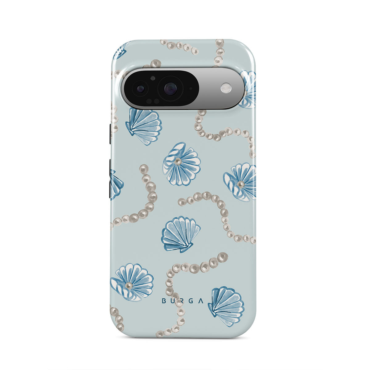 Este design contém: pérolas, conchas, fundo azul claro, elementos marinhos.