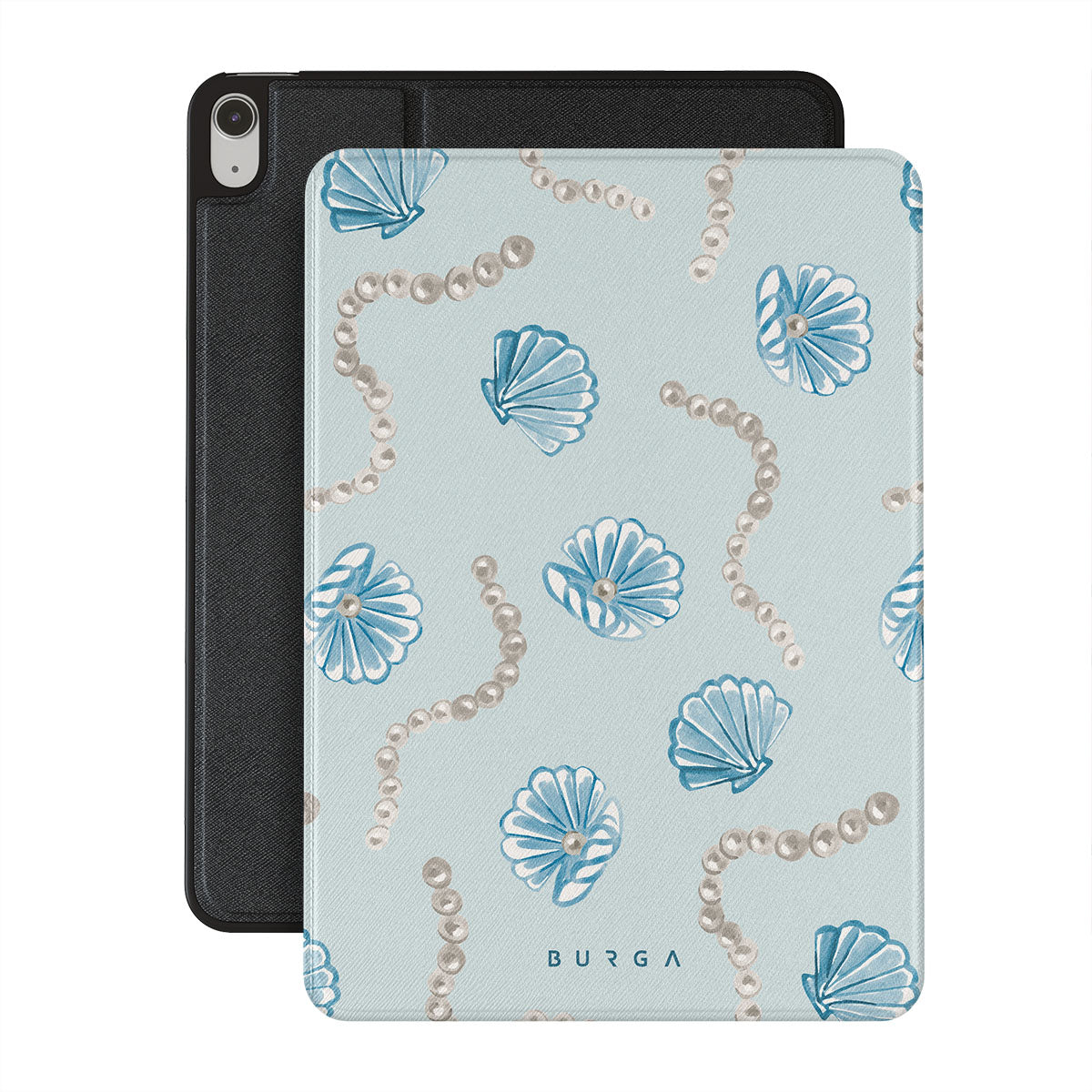Este design contém: pérolas, conchas, fundo azul claro, elementos marinhos.