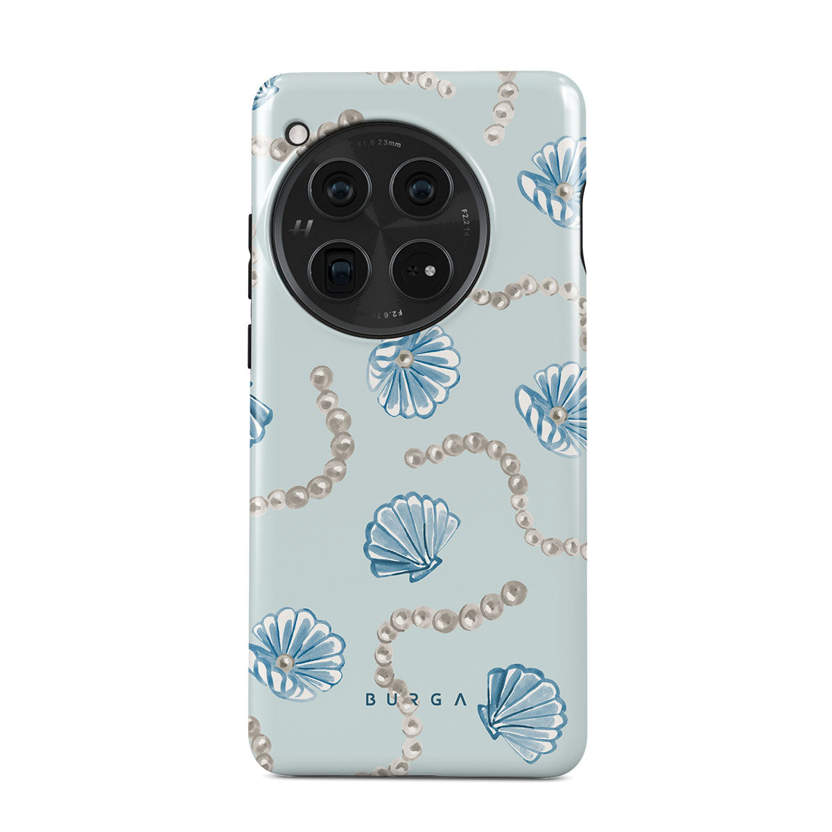 Este design contém: pérolas, conchas, fundo azul claro, elementos marinhos.