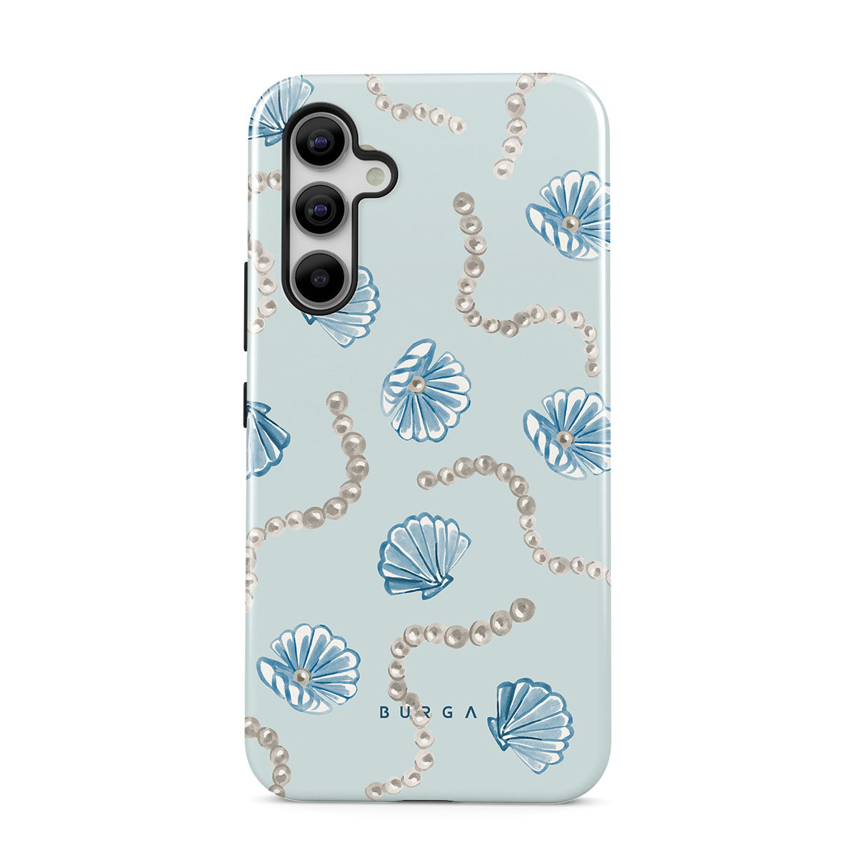 Este design contém: pérolas, conchas, fundo azul claro, elementos marinhos.