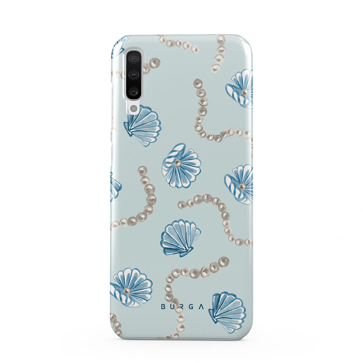 Este design contém: pérolas, conchas, fundo azul claro, elementos marinhos.