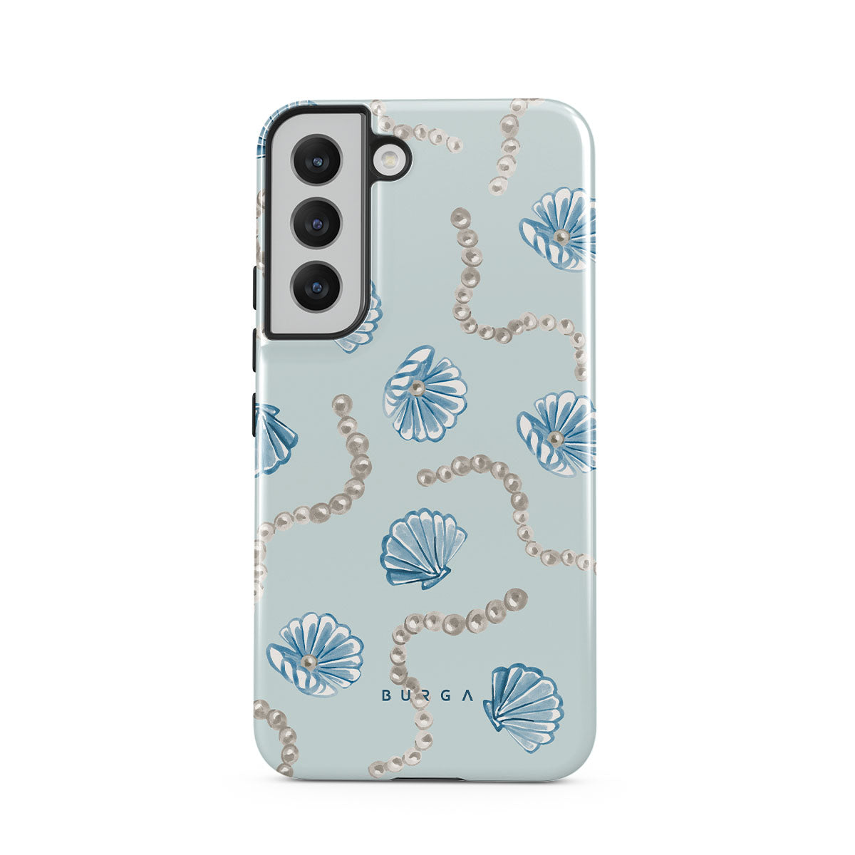 Este design contém: pérolas, conchas, fundo azul claro, elementos marinhos.