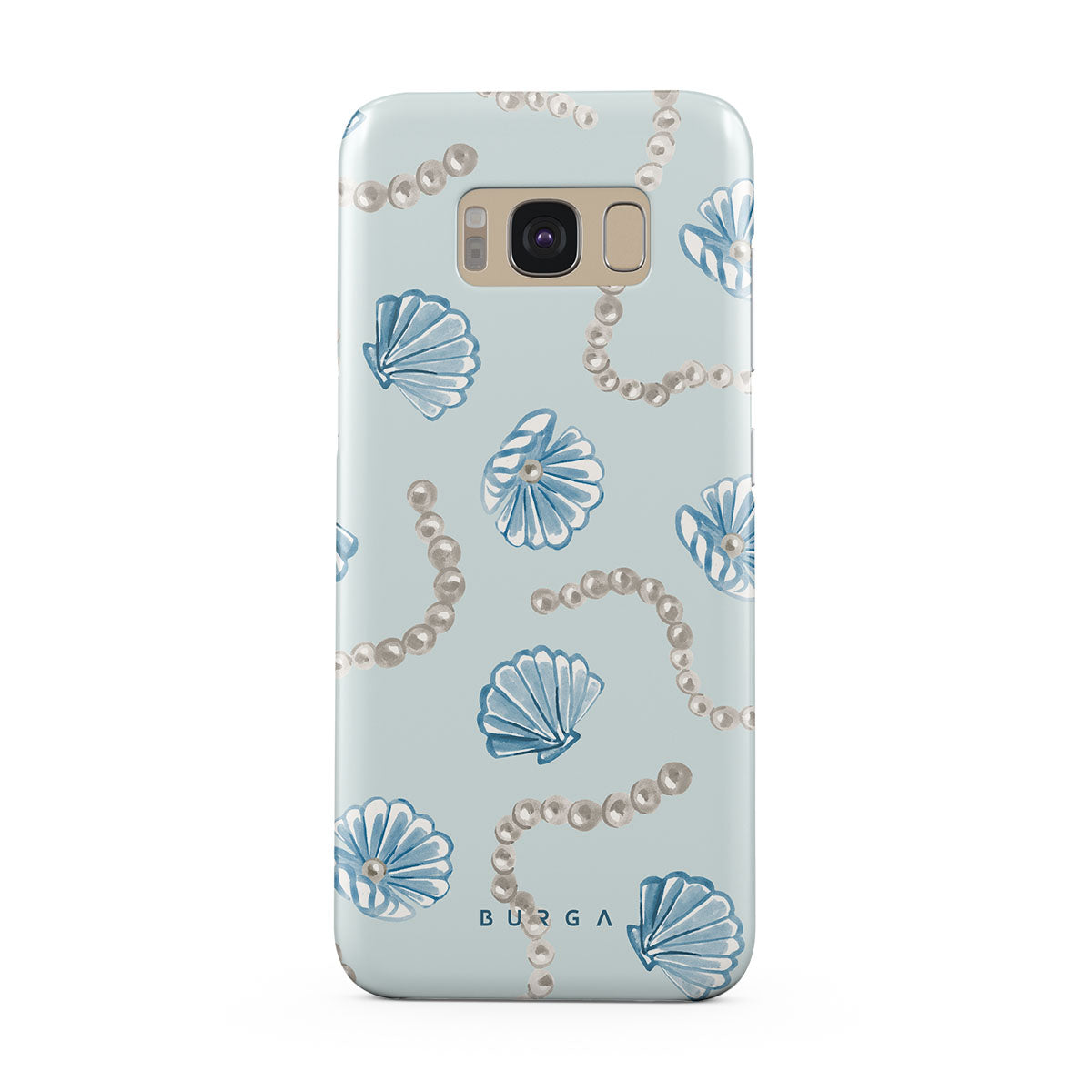 Este design contém: pérolas, conchas, fundo azul claro, elementos marinhos.
