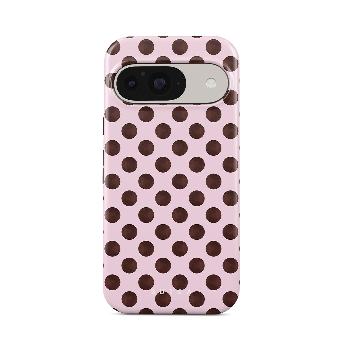 Este design contém: um padrão de bolinhas retrô, fundo rosa com bolinhas marrons.
