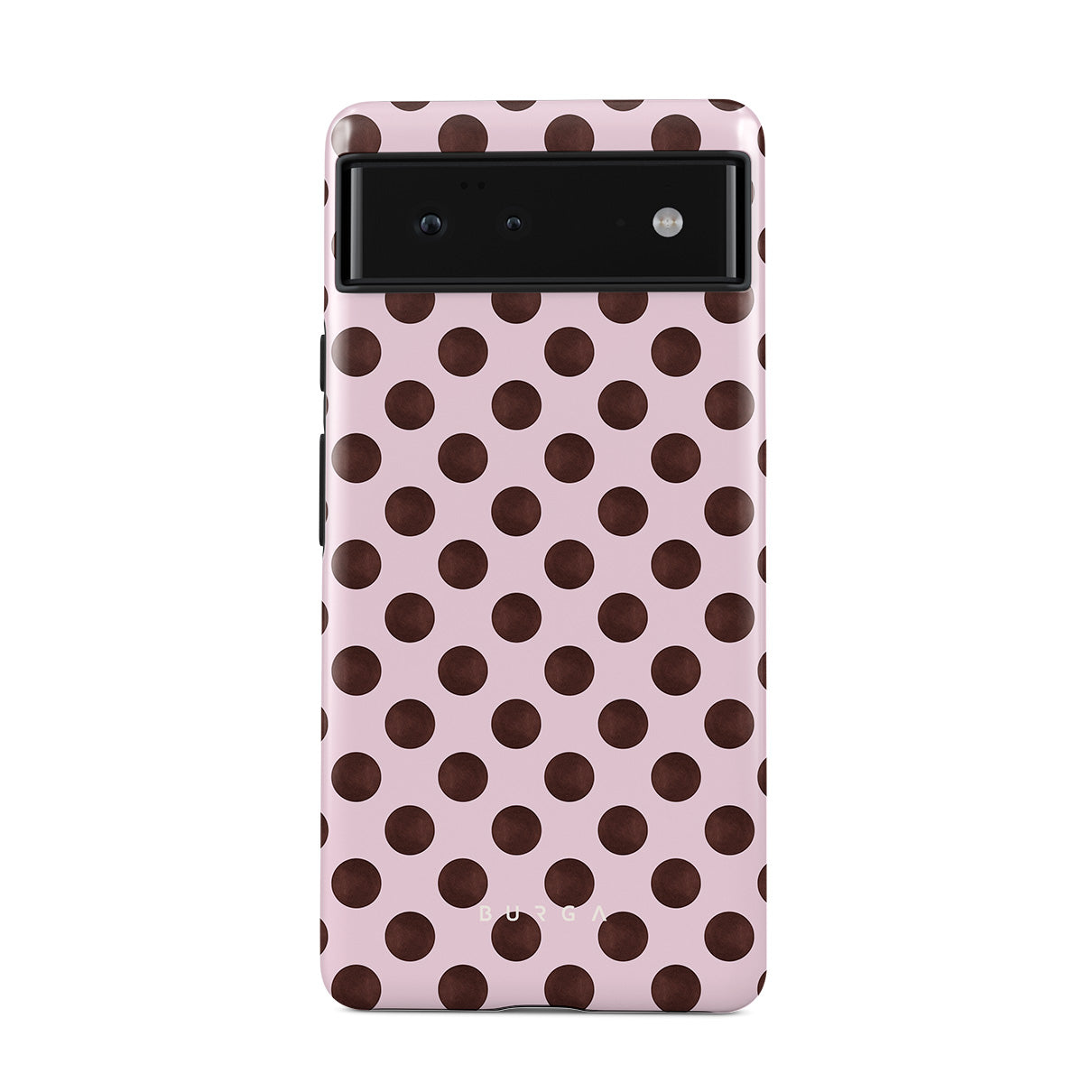 Este design contém: um padrão de bolinhas retrô, fundo rosa com bolinhas marrons.
