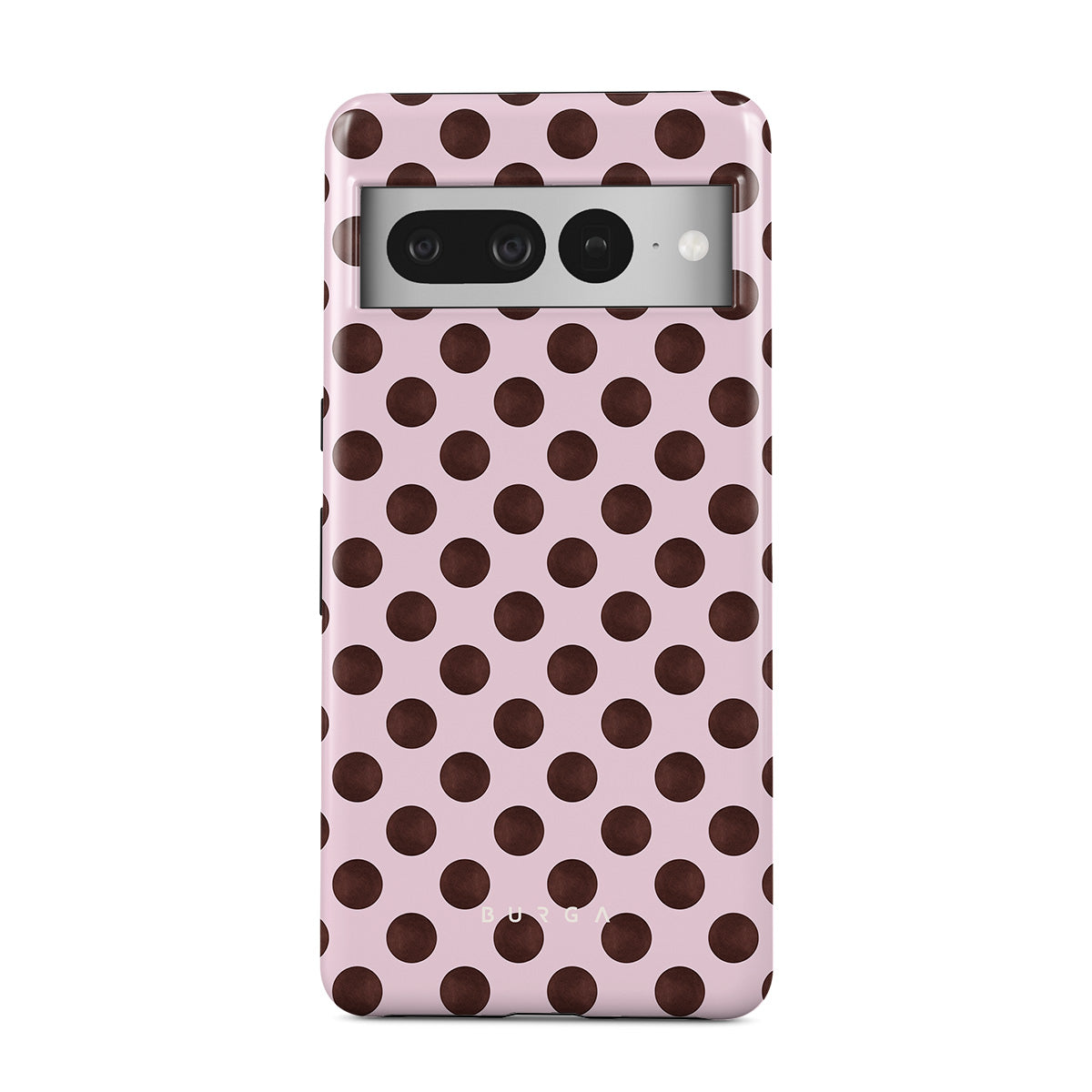 Este design contém: um padrão de bolinhas retrô, fundo rosa com bolinhas marrons.