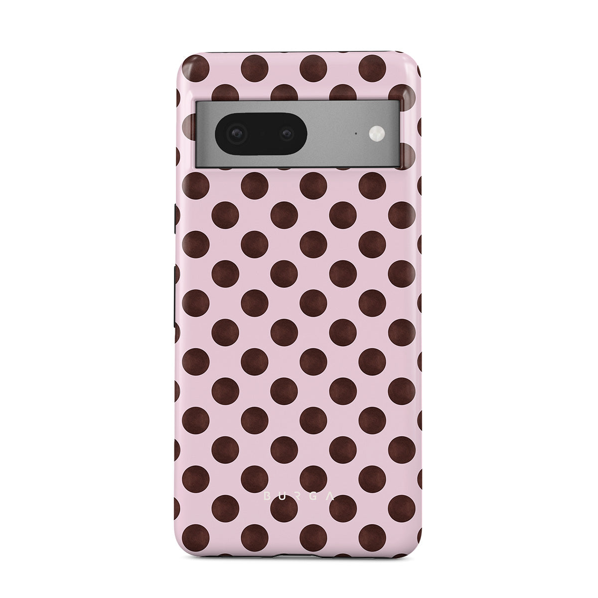 Este design contém: um padrão de bolinhas retrô, fundo rosa com bolinhas marrons.