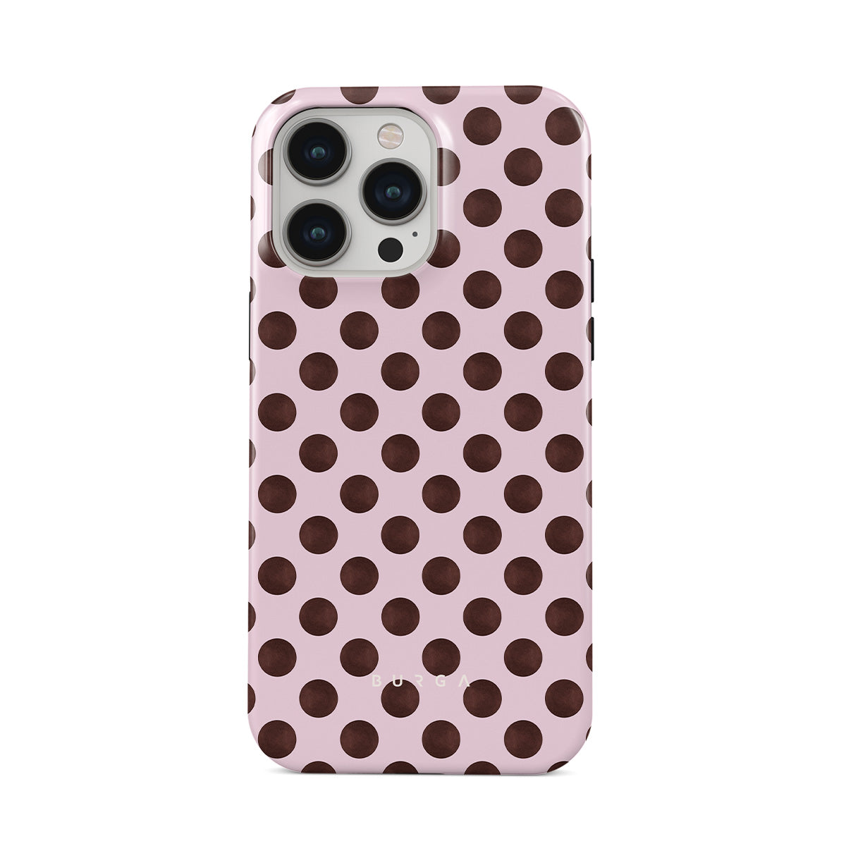 Este design contém: um padrão de bolinhas retrô, fundo rosa com bolinhas marrons.