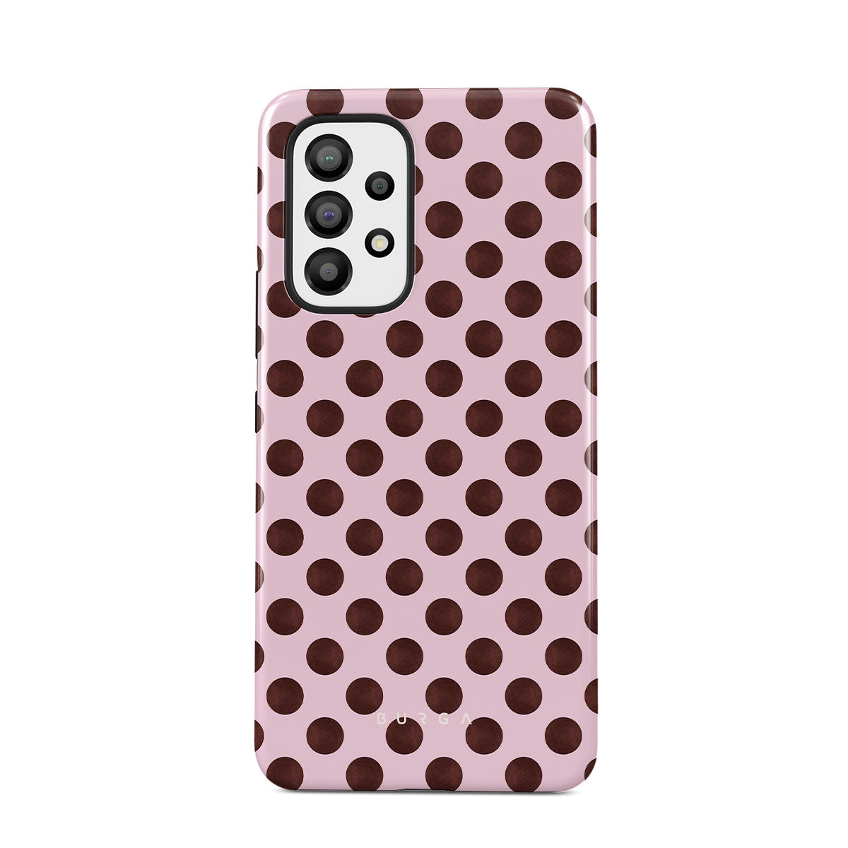 Este design contém: um padrão de bolinhas retrô, fundo rosa com bolinhas marrons.