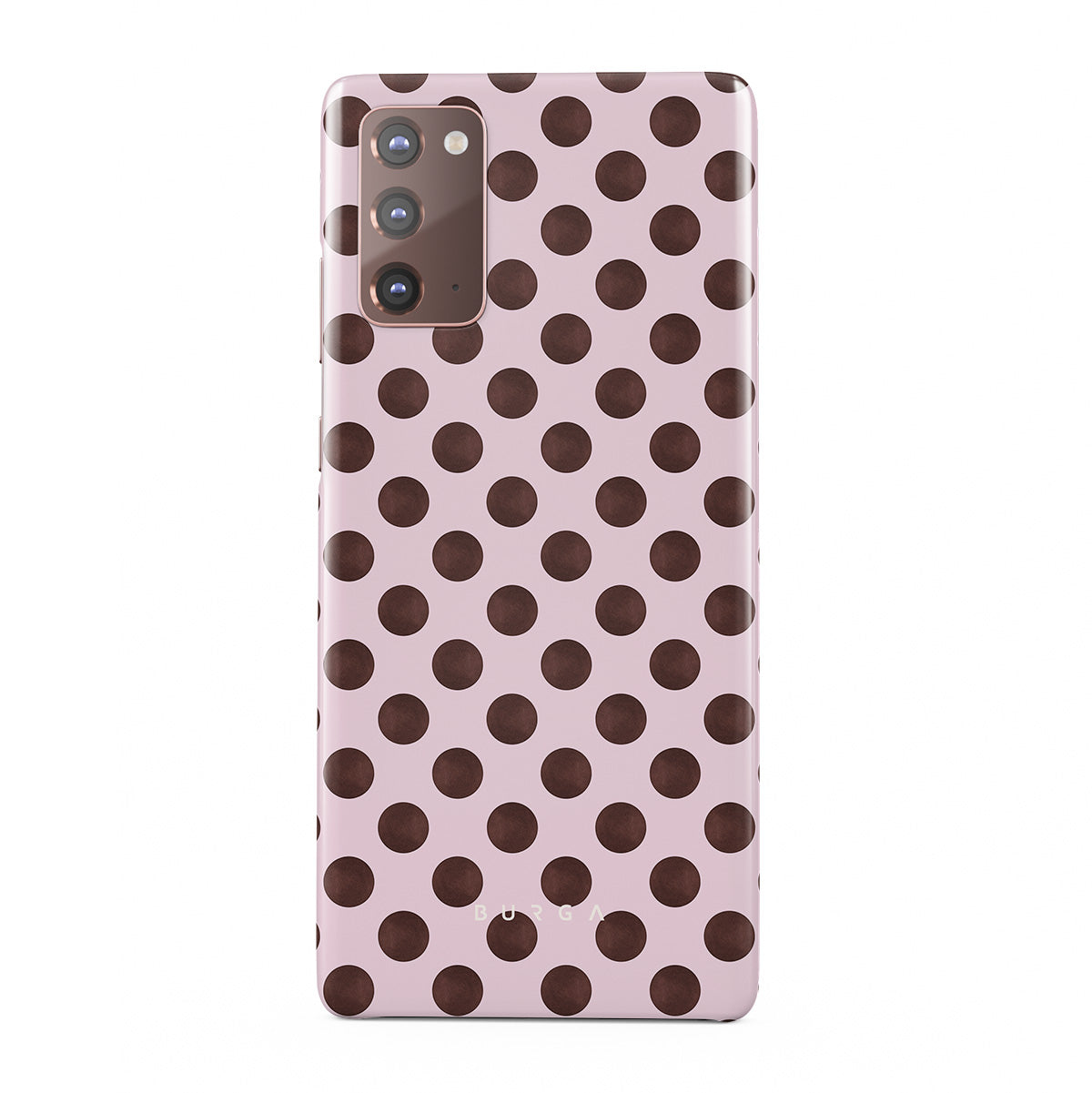 Este design contém: um padrão de bolinhas retrô, fundo rosa com bolinhas marrons.